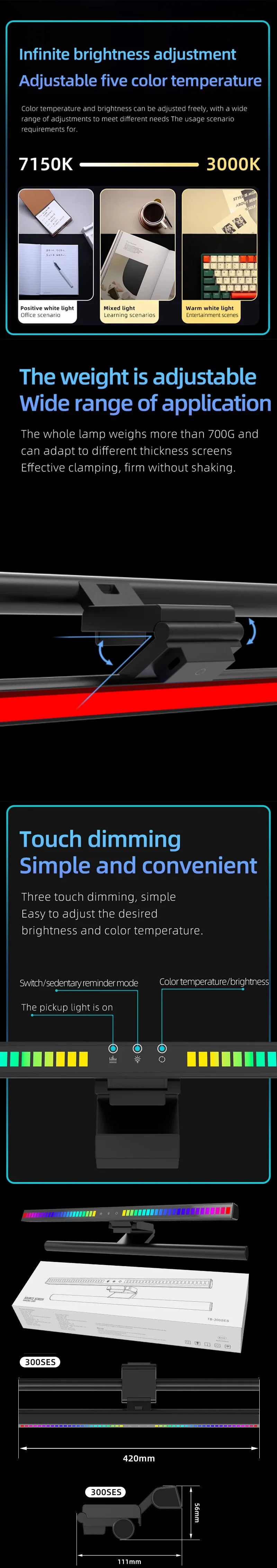 Touch sensitive controls for monitor lights without worrying about control lines. Equipped with an anti clamp for stable installation on curved monitor screens.