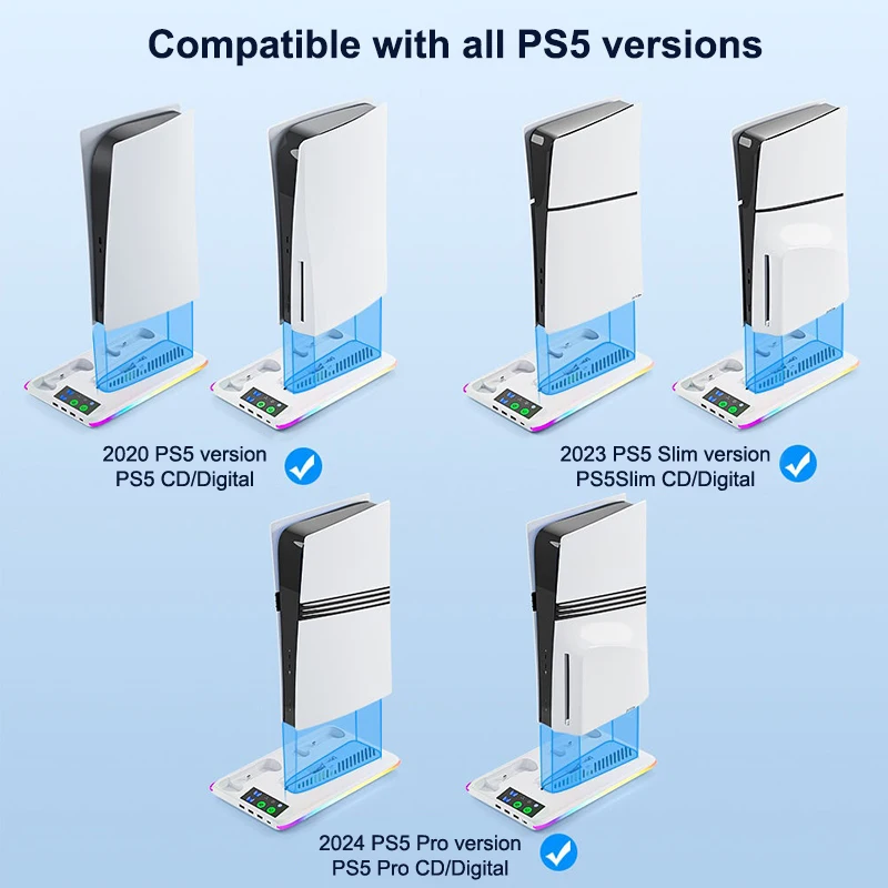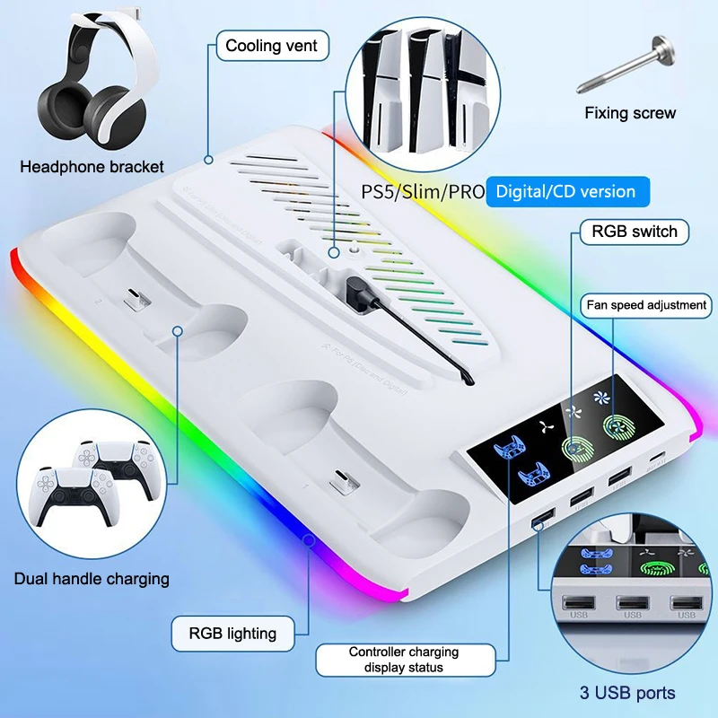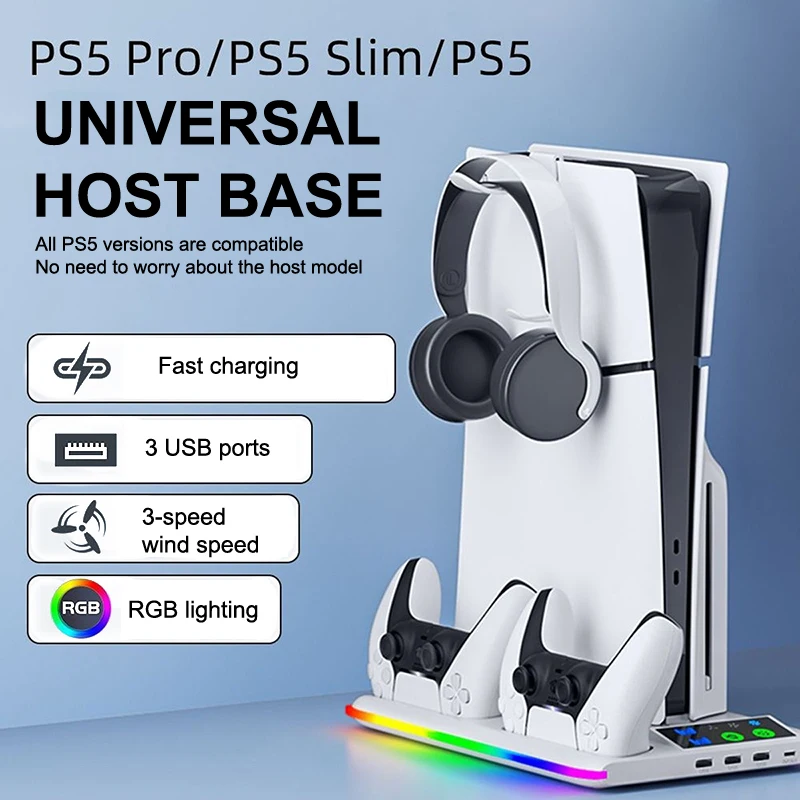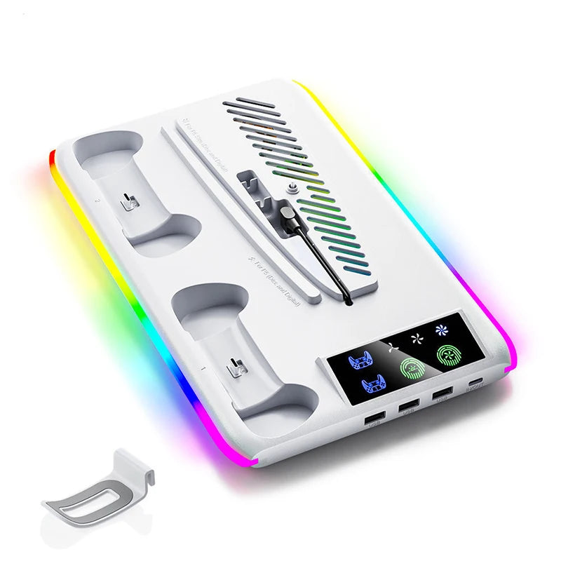 For PS5 Slim/PS5 Stand Cooling Holder & Controller Charging Station With Headphone Hook RGB Light 3 Levels Cooling Fan For PS5