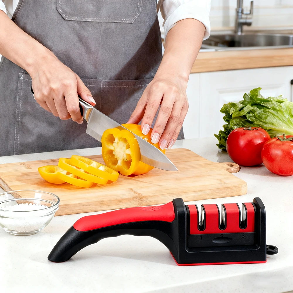 The three-stage sharpening process ensures that your knives are sharpened to perfection, enhancing their performance and longevity.