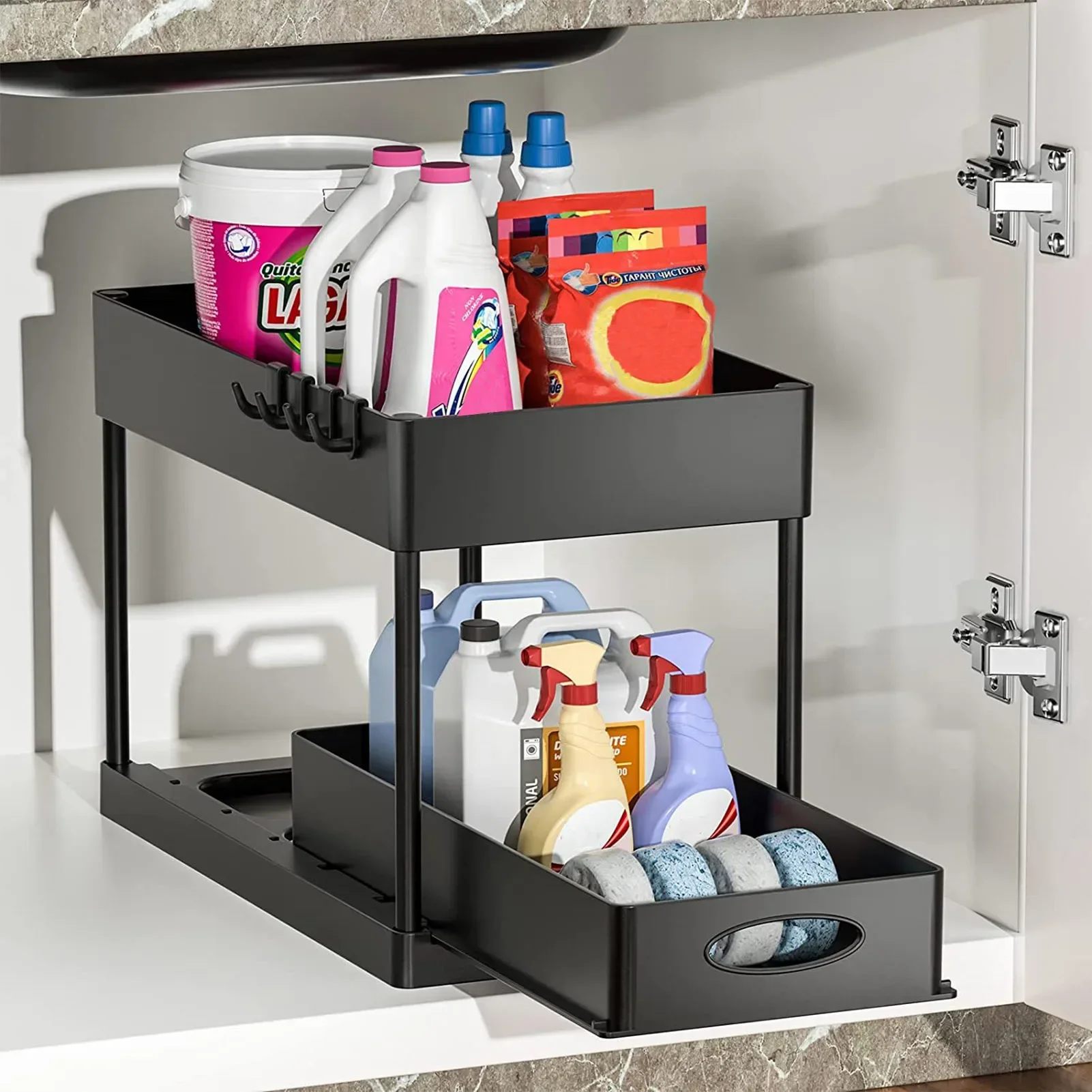 This under sink organizer is designed with a double layer, maximizing the use of vertical space.Comes with 4 side hooks for hanging some small items, effectively using the limited space.