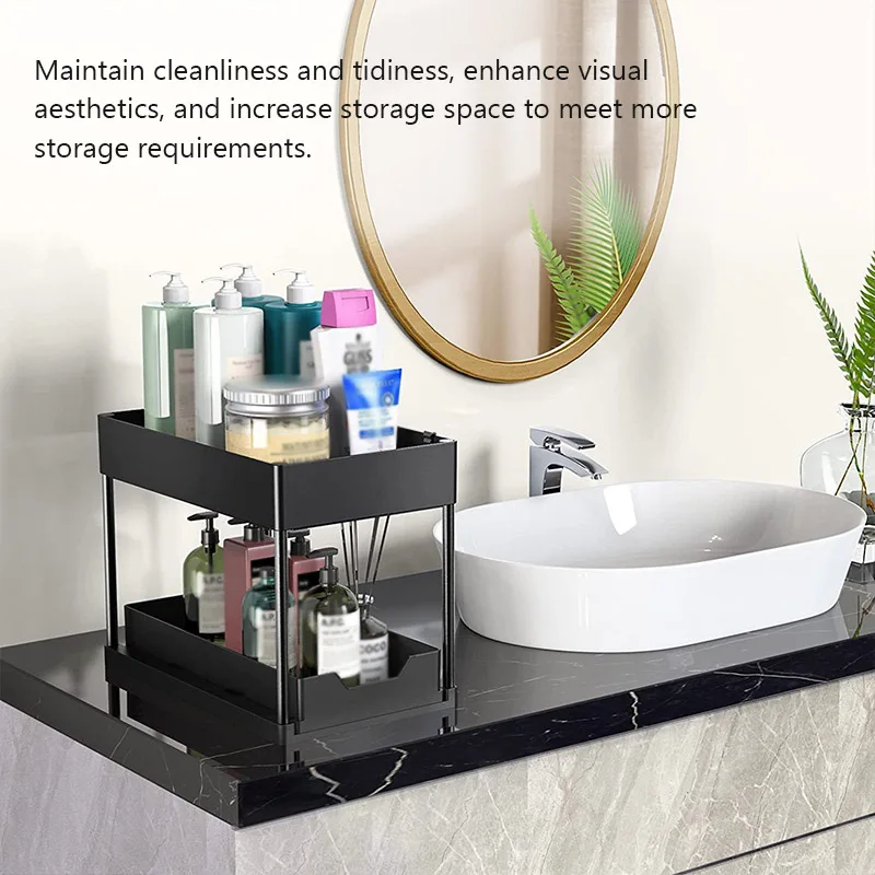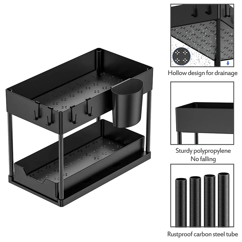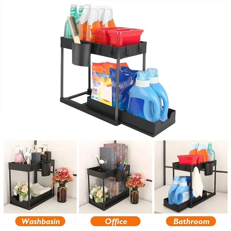 Kitchen Shelf Pull Out Organiser Sliding Cabinet Basket Organizer with Hooks 2 Tier Multi-Functional Bathroom Storage Shelf
