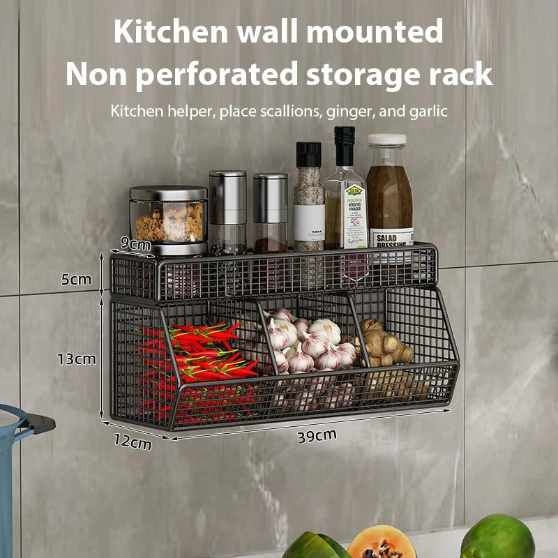 Kitchen Wall Mounted Storage Rack Vegetables Fruits Holder Onion Garlic Condiments Spice Double Layer Storage Shelf Organizer