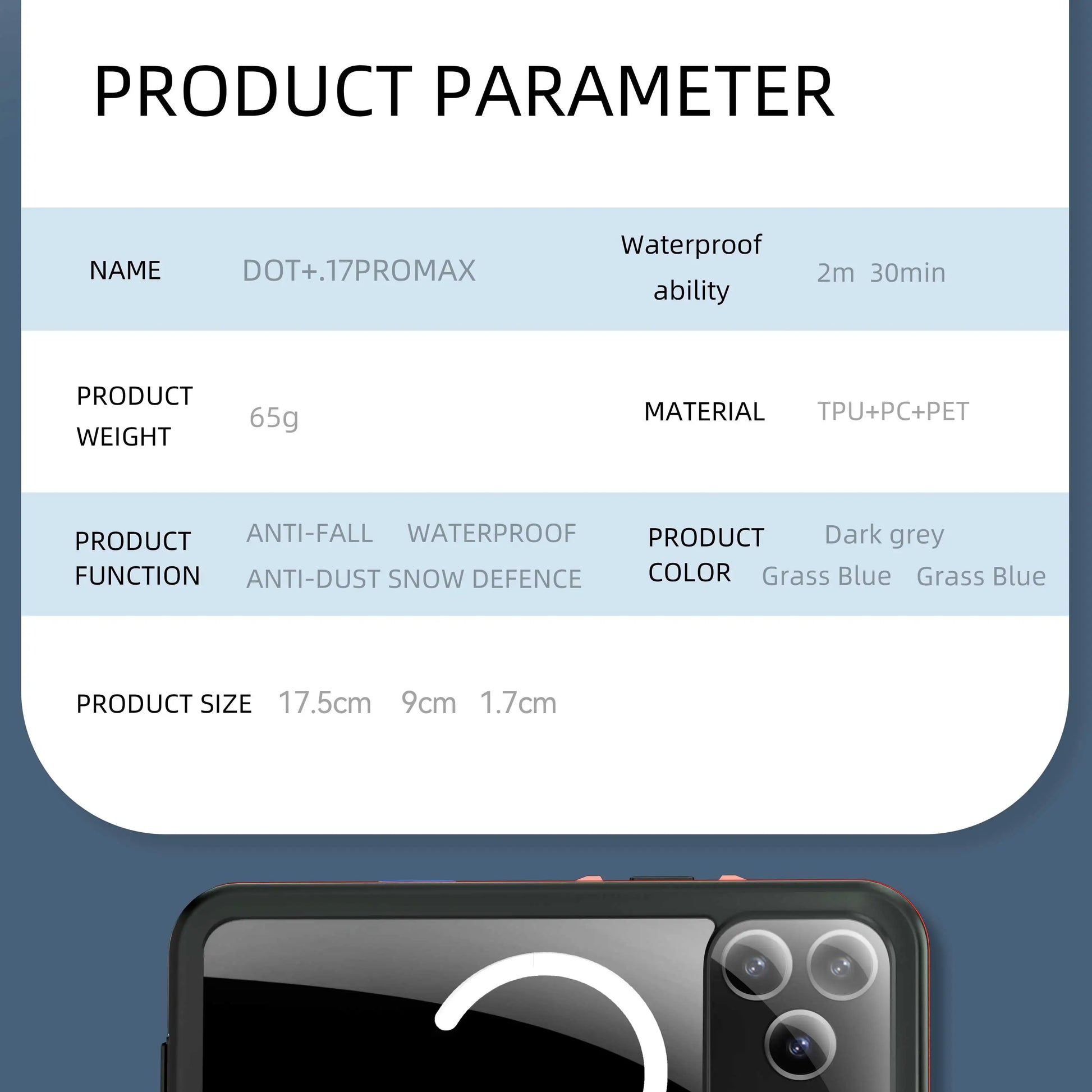 This phone case offers IP68 waterproof protection, ensuring your iPhone remains safe in water up to 1.5 meters deep for 30 minutes.