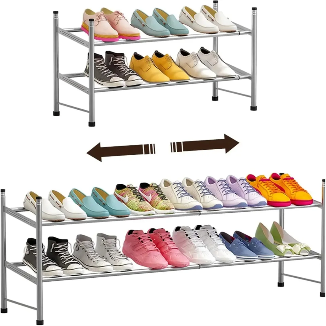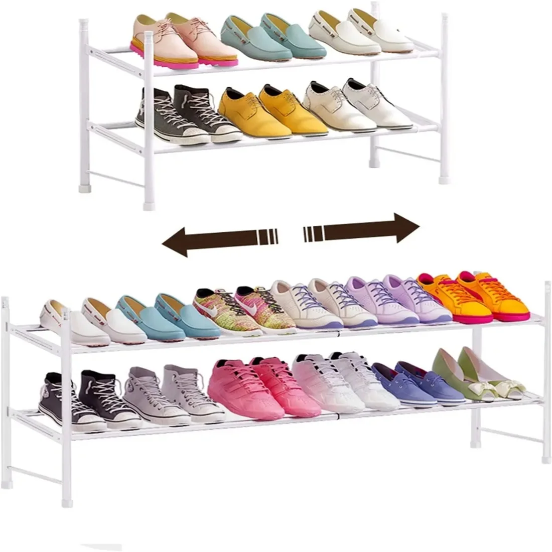 - 【SPACE SAVING】 Measuring (60-110cm) x 22cm x 36.5cm, this 2 tier shoes rack can hold up to 6-12 pairs of shoes ( When shrinking:Each layer can hold three pairs of shoes; After stretching:Each layer can hold six pairs of shoes)